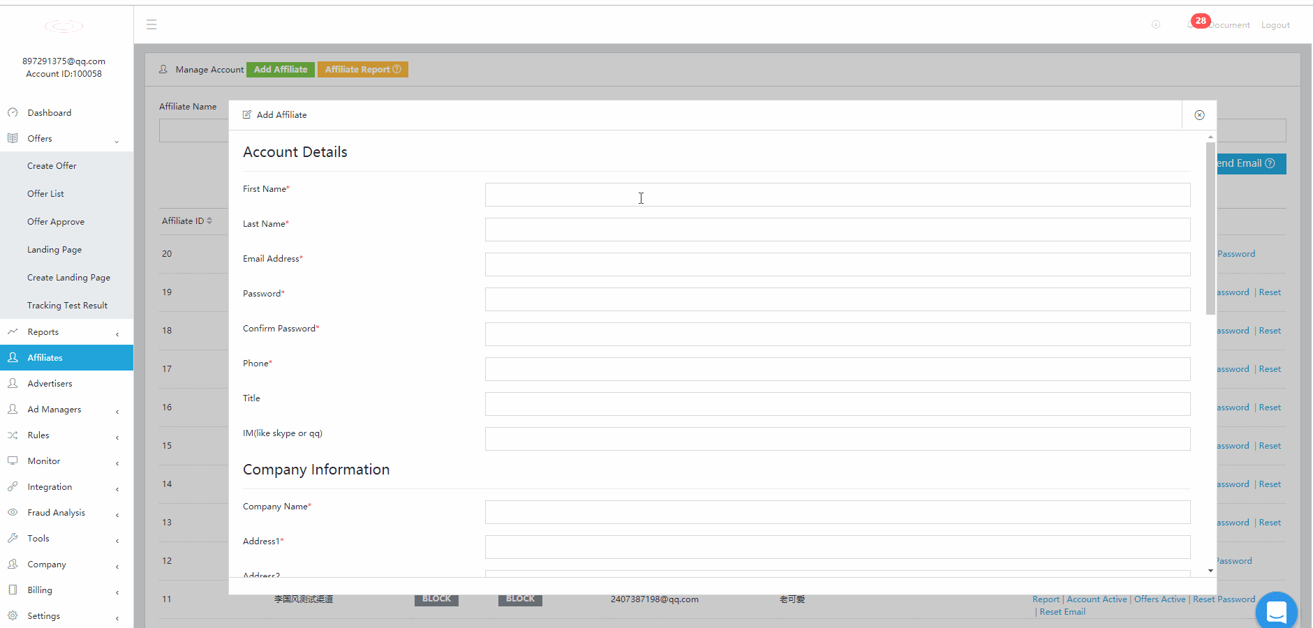 Click Add Affiliate button --> Fill in information --> Fill in Tracking Format